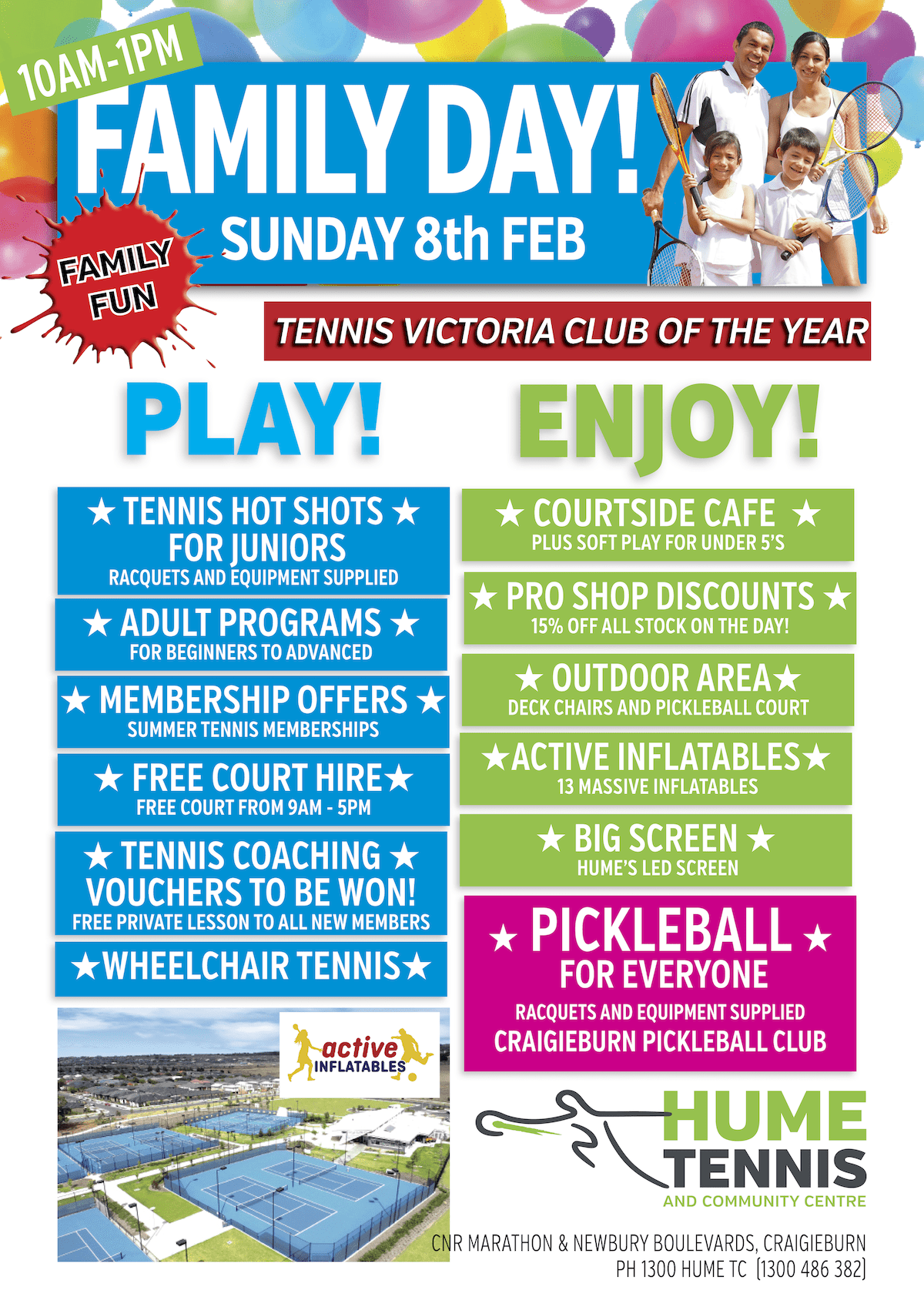 Get ready for a fantastic day of tennis and pickleball activities, and family fun at Hume Tennis and Pickleball Family Day this Sunday, February 8th, from 10 AM to 1 PM! Whether you’re a longtime member or brand new to our tennis community, this event is open to everyone—so gather your family and friends.